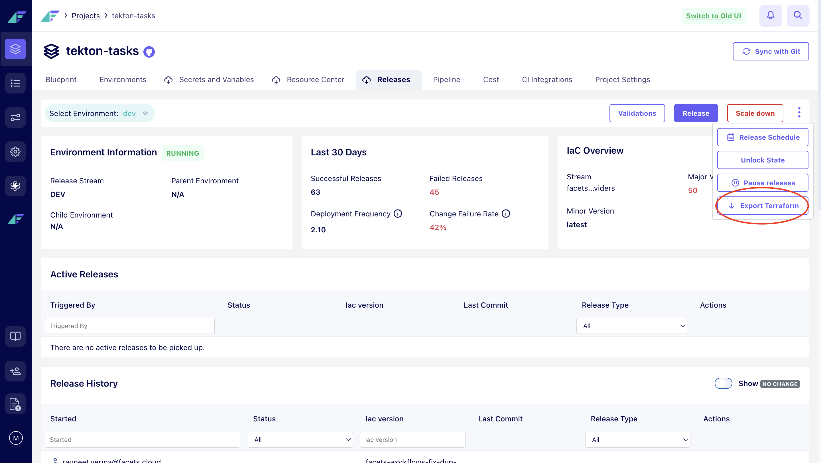 - Terraform export provides an option to download the Terraform code of any environment (irrespective of the status of the environment). Once selected, it will trigger a release and allow users to download the terraform code post the release is successful.