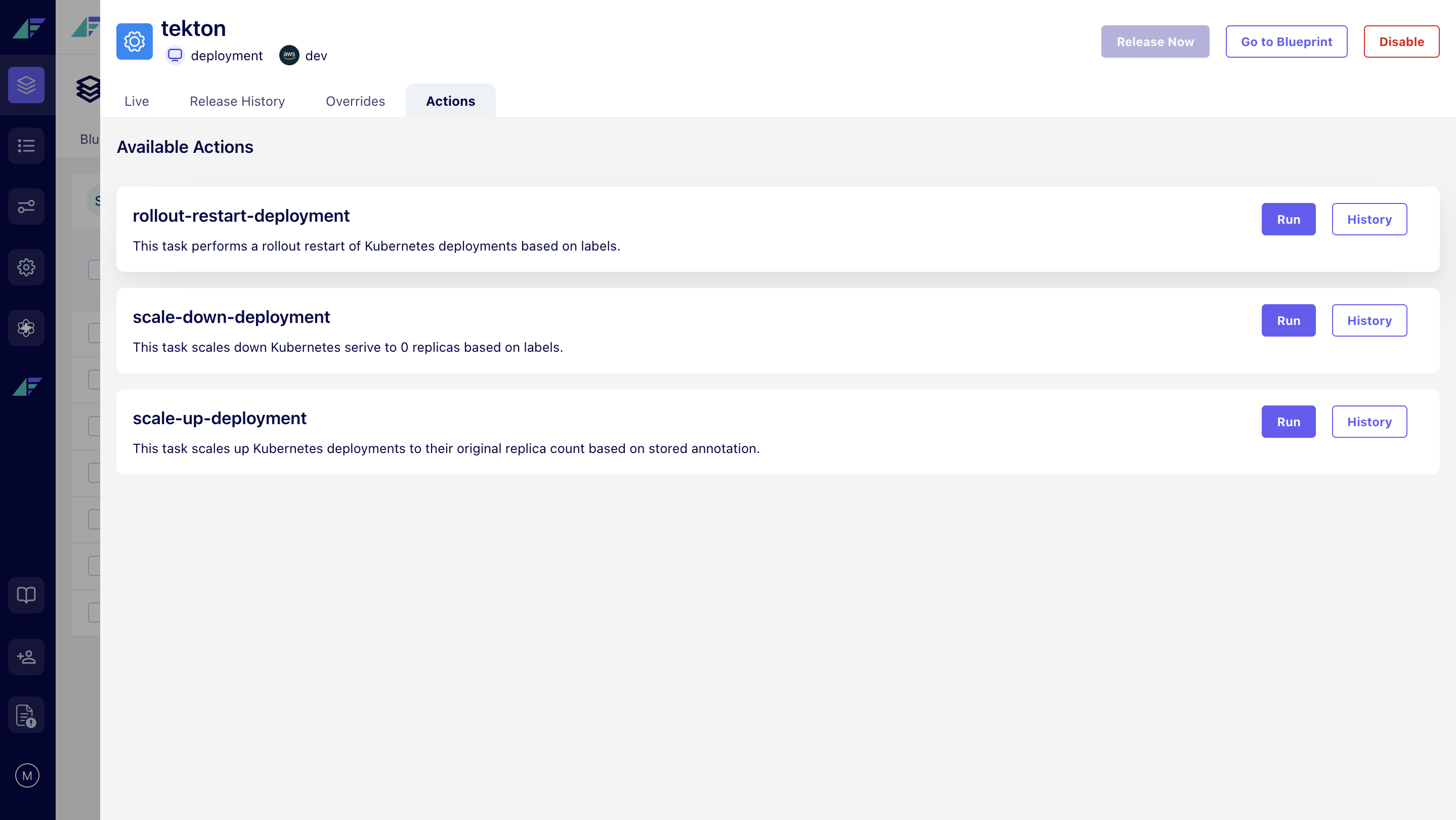 - Developers can find and run available tasks under the new 'Actions' tab on any resource page. Platform Engineers can begin creating custom automations by defining them as code in a module's actions.tf file.
